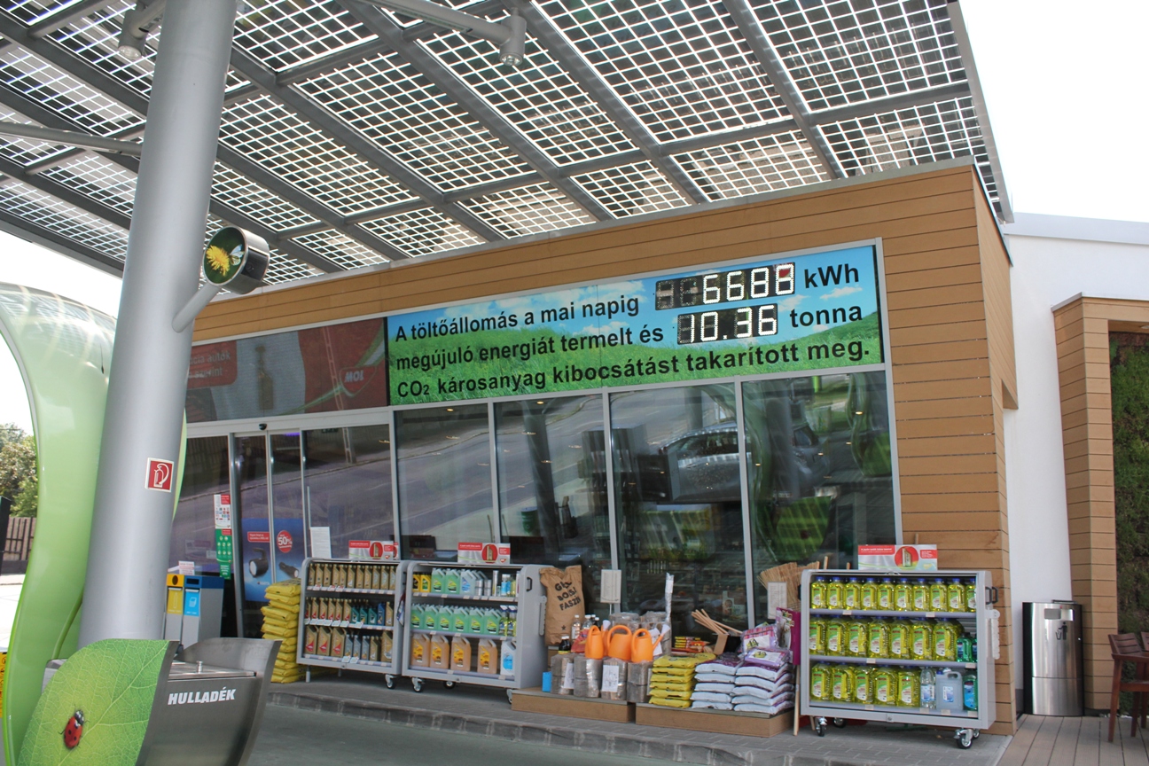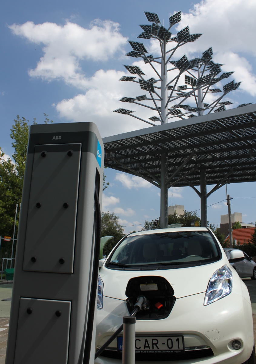 is villogni kezdett, majd a teljes töltés eléréskor el is aludt, és a töltési rendszer is kikapcsolt. Az autó akkumulátora 24kwh kapacitású, ennek teljes felöltése egy átlagos, kb. 3kW-tal terhelhető háztartási konnektorból hozzávetőlegesen 8 órát vesz igénybe. A töltés összköltsége kb. 1.200 forintnyi összeggel terhelte meg a villanyszámlát. Ez nem mondható soknak, mert ezért kb. átlagosan 150 kilométert tehetünk meg. Egy hétköznapi benzines autó esetében 150 km megtétele 3-4 szerese ennek.A visszaút előtt, a normál töltés miatt 100 százalékosan feltöltődött az akkurendszer. (gyorstöltésnél, ami kb. fél óra, csak 90 százalékra tölt a rendszer) A megtehető kilométer Eco üzemmódban 165 km volt. Ezért a visszaútra is bátran vállalkozhattam a tapasztalatok tükrében. Mivel most több km állt rendelkezésemre, már dinamikusabban vezettem, és ugyanúgy előzgettem, mint a saját normál benzines autómmal. Budapestre érve maradt még kb. 40 km megtételére elegendő akku teljesítmény, ezért az Istenhegyi MOL kút felé vettem az irányt, ahol megtalálható az ABB gyorstöltője. Az Istenhegyi MOL kút egy ÖKO töltőállomás, és egy igazi különlegesség a benzinkutak között. [%IMAGE=18266%]A kiszolgáló terület feletti 195 m[%SUP%]2[%SUP%]-es ún. szolár előtető az árnyékoláson túl az üvegszerkezetbe laminált polikristályos napcellái (Building Integrated Photovoltaics) segítségével a megújuló napenergiát alakítja át elektromos árammá és látja el vele a töltőállomást. A két tető fölé magasodó egyedi kialakítású “szolárfa” ágain 60 db rombusz alakú napcellás “levél” ad további közel 50 m[%SUP%]2[%SUP%] hasznos felületet. Ezen kívül találhatunk zöldfalat, zöldtetőt, hasznosul az esővíz, és szinte minden megvilágítás LED alapú.