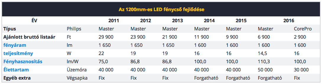 Magyarország egyik vezető LED webáruháza, a Deloitte Fast 50 listán is szereplő www.ledleet.hu 2011 és 2016 között vizsgálta meg az 1200 mm-es LED fénycsövek fejlődéstörténetét. A vizsgálat eredményeként elmondható, hogy a